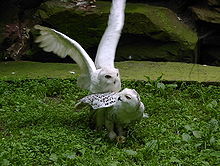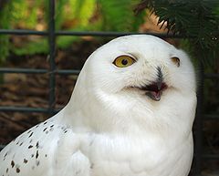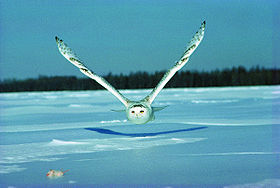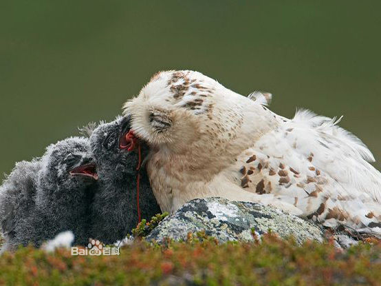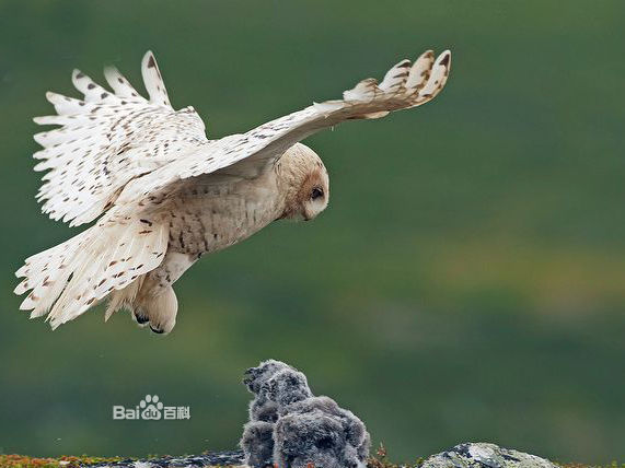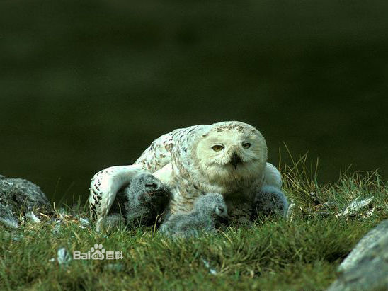 简介雪鸮别名白夜猫子,俗名白猫头鹰、查干-乌盖勒,属于鸱鸮科,学名为 Nyctea scandiaca。 雪鸮是一种大型猛禽,属于鸱鸮科。雪鸮是一种稀有的白色猫头鹰,也有人称呼它“雪鹰”,通常生活在寒冷地区。 雪鸮多见于北极圈内,但它们也居无定所,这完全由食物的数量来决定。它习惯了北极的寒冷天气,所以,它也被称为“北极猫头鹰”或“白色大猫头鹰”。雪鸮的叫声多种多样,当遇到威胁或骚扰时,会发出一种奇怪的敲击声。 大型猛禽。全长约60厘米。全身羽毛白色,具褐斑。眼先和面盘稍染浅褐色;头顶杂有少数黑褐色斑点。下体腹部具窄的褐色横斑。嘴铅灰或黑褐色。爪灰褐,端黑。栖息于冻土和苔原地带,也见于荒地丘陵。以鼠类、鸟类、昆虫为食。在北极和西伯利亚繁殖,越冬时可见于中国北方部分地区,十分罕见。 编辑本段主要分类雪鸮最初是由卡尔·林奈(Linnaeus)于1758年分类。近年来,雪鸮被认为是单型种,因此学名变为Nyctea scandiaca,但後来线粒体细胞色素b基因(Olsen等,2002年)表明其与雕鸮属关系较近,因此被分入雕鸮属。末次冰期中,中欧曾有雪鸮古亚种Bubo scandiacus gallicus存在,但现代此亚种已不复存在。 雪鸮的种加词scandiaca是“斯堪的纳维亚”(Scandinavia)的拉丁化形容词形式,意为“斯堪的纳维亚的”,因为雪鸮最初是于北欧被观察到。 编辑本段形态特征雪鸮属于体形较大的鸮类,体长约为50~71厘米,雌性平均体长为66厘米,雄性平均体长为59厘米,翼展125~165厘米,体重1.6~3千克,雌性平均重2.3千克,雄性平均重1.8千克,雄性体型明显小于雌性;由于本物种分布在高纬度和高海拔的寒冷地区,因而雪鸮通体几乎纯白色,体羽端部近黑色,因而在头顶、背部、双翅、下腹遍布黑色扇形斑点,而雌鸟和幼鸟的黑色斑点更多;无其他鸮类常见的耳状羽,浑圆雪白的头部看起来颇为可爱;虹膜黄色;喙黑色;足黄色,强健有力,覆有密羽,爪黑色,钩曲,长2.5~3.5厘米,能迅速征服大型猎物。雄性幼鸟的颈部、颈后和尾羽都比雌性幼鸟白。雄性雪鸮随着年龄的增长会越来越白,部分年老的雪鸮全身会接近纯白色,而雌性雪鸮身上的一些斑点终身不消失。雪鸮的羽毛非常浓密,正是这些浓密的羽毛使它们能在气温−50℃的环境下还能保持38~40℃的体温。因此,如果它们遇到强风,就会找到石堆、雪堆或是干草堆作为避风处,然后蜷缩身体贴在地面上,这样它们浓密的羽衣就能为它们御寒。 它们雪白的羽毛在冬季是非常好的伪装,不过冬季一过这种优势就不复存在了。当春天来临时,地面上的雪就会开始融化,而雪鸮仍会选择有斑驳冰雪的地方栖息。目前人们猜测它们产生这种行为可能是为了伪装、驱虫或是保持凉爽,但实际的原因仍不为人知。 与很多鸮类不同的是,雪鸮在很多地域属于昼行性鸟类,白天活动晚上休息,偶尔也在黄昏后捕猎。它们的飞行姿态平稳有力,俯冲力量强,而升空速度也很快。它们能进行短程贴地飞行,并会不时降落在地面或杆上停息。在天气炎热时,雪鸮会通过呼气和张开翅膀来降温。它们大部分时间都会栖息在视野开阔的地点,如篱笆、草垛、树木、建筑物、电线杆,密切注意其他猫头鹰入侵者,或是伺机从猎物背后悄悄捉住它们。 它们是独居、划定地盘的鸟类,在食物充足的年份里,1平方公里中平均只会有两对雪鸮,而在食物匮乏的年份里则会更少。冬季时雌鸟会定居一处并划分地盘,而且会保卫领地,阻止外来者入侵,直到春天它们才会离开此地向北迁徙。 最长寿的圈养雪鸮寿命达到至少35岁,而已知最长寿的野生雪鸮寿命为9岁5个月。 大小量度:体重♂1000~1760g,♀1350~1950g;体长♂540~590mm,♀585~635mm;嘴峰♂25~27mm,♀24~29mm;翅♂380~420mm,♀400~435mm;尾♂210~240mm,♀212~235mm;跗蹠♂50~60mm,♀45~60mm。(注:♂雄性;♀雌性) 编辑本段主要分布雄雪鸮面部近观雪鸮繁殖于环北极冻土带以及北极圈内的不被冰雪完全覆盖的岛屿上,包括阿拉斯加、加拿大、格陵兰、斯堪的纳维亚北部、俄罗斯、新地岛北部和西伯利亚北部。由于在特定季节食物匮乏,可能漂泊到欧洲南部、高加索山脉、土耳其、日本、朝鲜、延喜马拉雅山甚至可能游荡到印度西北部,得克萨斯州、佐治亚州甚至加勒比地区也曾有迷鸟记录;冬季,雪鸮可见於加拿大和美国北部,美国南部、冰岛、不列颠群岛、欧洲北部、俄罗斯中部、黑龙江省北部、新疆西部和库页岛也有少数雪鸮出现,在河北北戴河有迷鸟记录。虽然雪鸮主要分布在北极圈附近,但种群数量增多会造成苔原的食物短缺,这使得它们周期性南迁,周期可能为3~4年。雪鸮化石发现地点的南端是北回歸線,有可能此地是雪鸮的起源地;而目前人们在隆冬时节发现雪鸮踪迹的最北端是位於北纬82°的埃尔斯米尔岛,在这个季节里极夜仍在继续。 栖息地雪鸮是北极苔原地区的留鸟,栖息于海平面至海拔300米以下的苔原地区,也可能栖息在低地盐化草甸或排水差的淡水湿草甸,在北半球高纬度地区和高海拔地区活动,主要是为了觅食。即使是夏季,它们的活动范围也都在北纬60°以北。不过由于它们的猎物种群数量变化很大,它们需要常常作出调整,这使它们成为频繁迁徙的鸟类,因此它们也偶尔会在北纬60°以南繁殖。食物不充足时雪鸮会向南部迁徙,在南方常见于乡村地区、市中心以及沙丘包围的湿地。南迁越冬时,雪鸮会选择草原、湿地、开放性田地、海岸线或