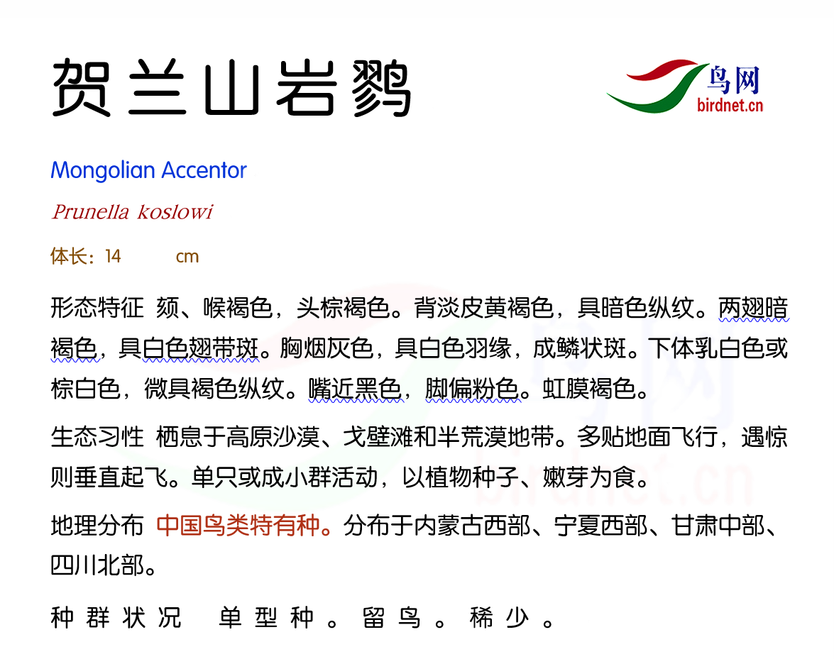 鸟种目科:雀形目 > - 岩鹨科 > - 贺兰山岩鹨