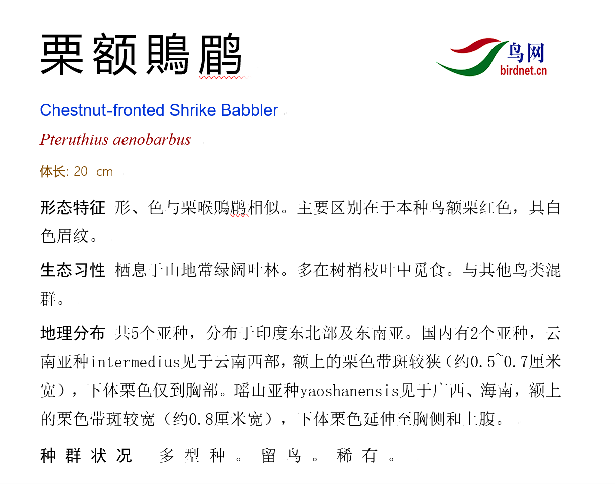 鸟种目科:雀形目 > - 莺雀科 > - 栗额鵙鹛