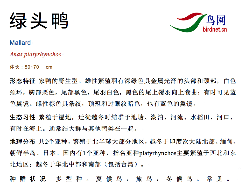 鸟类名称:绿头鸭