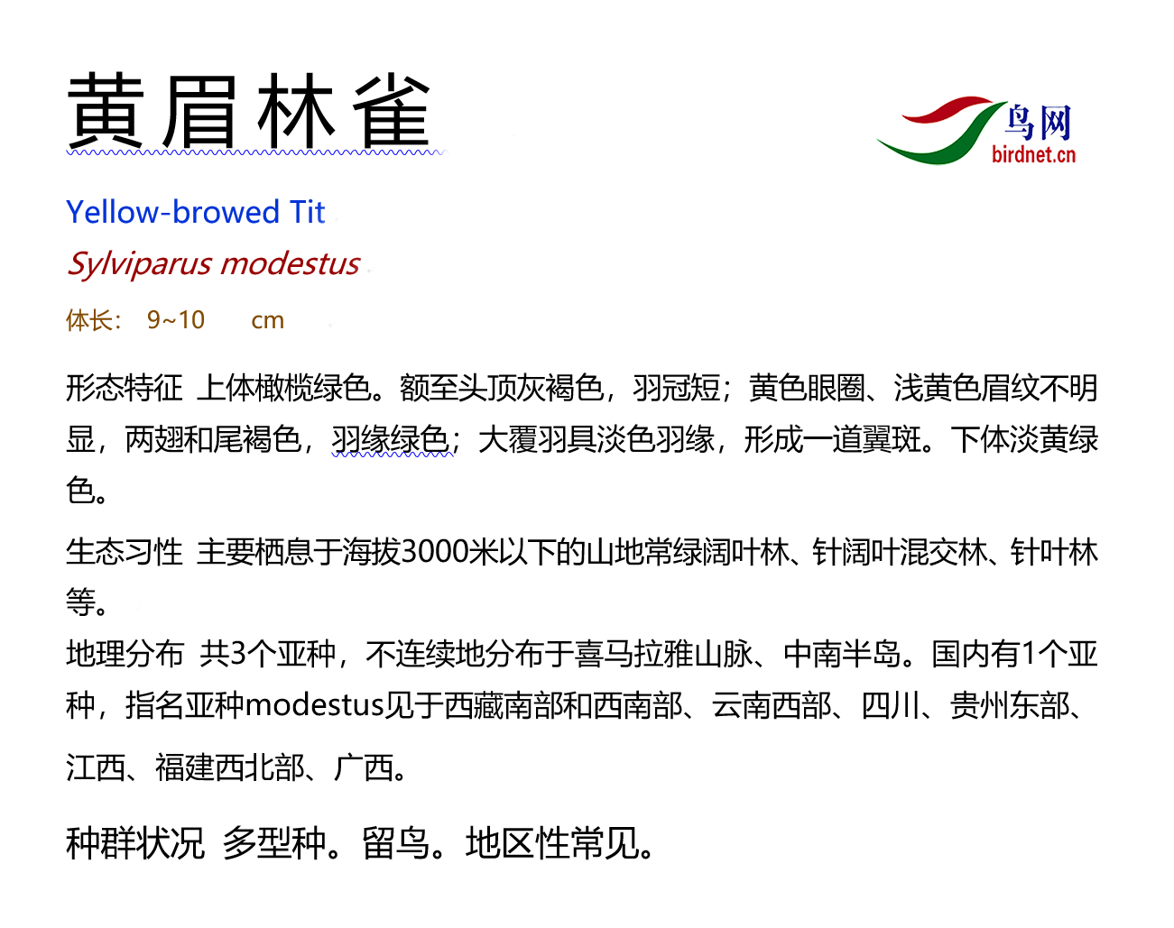鸟种目科:雀形目 > - 山雀科 > - 黄眉林雀