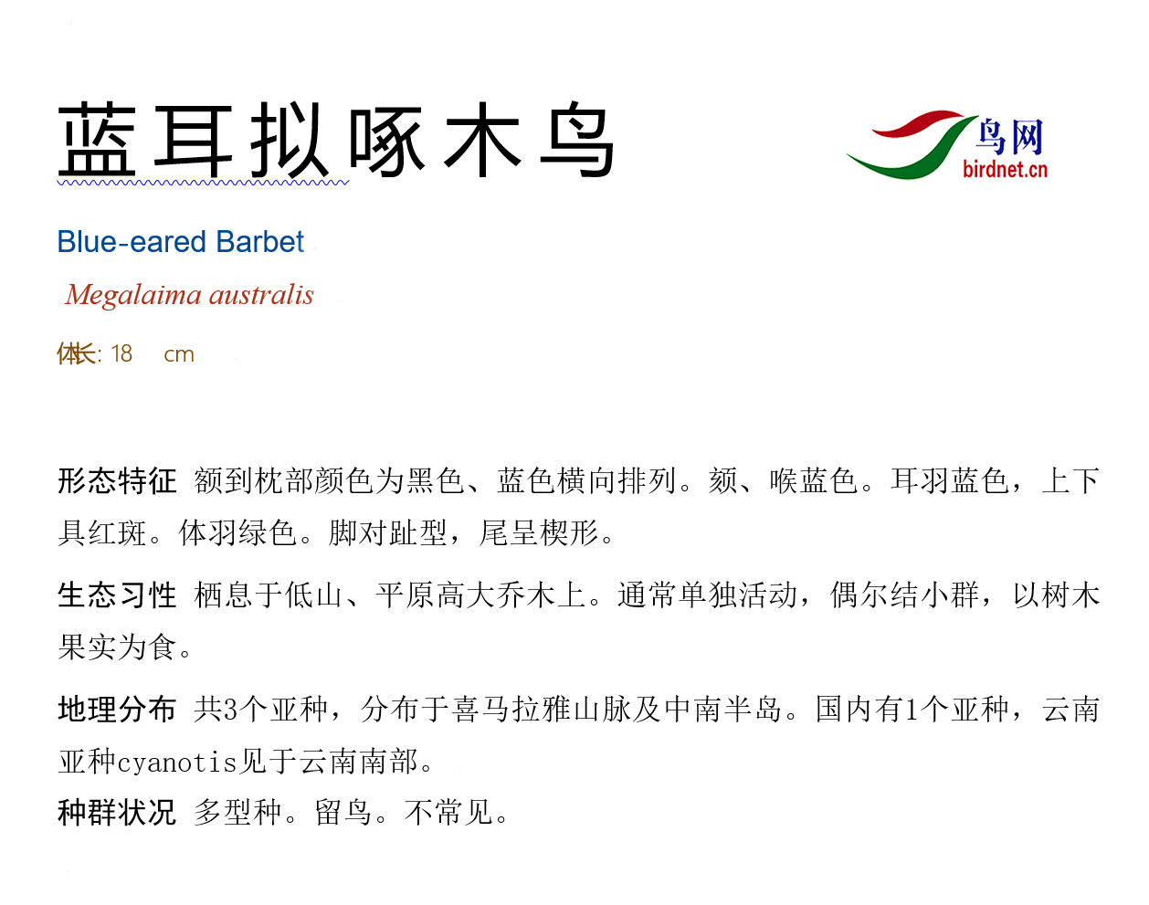 鸟种目科:啄木鸟目 > - 拟啄木鸟科 > - 蓝耳拟啄木鸟