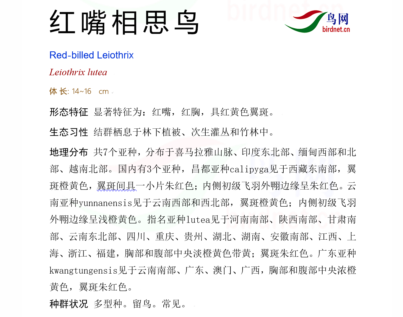 鸟种目科:雀形目 > - 噪鹛科 > - 红嘴相思鸟