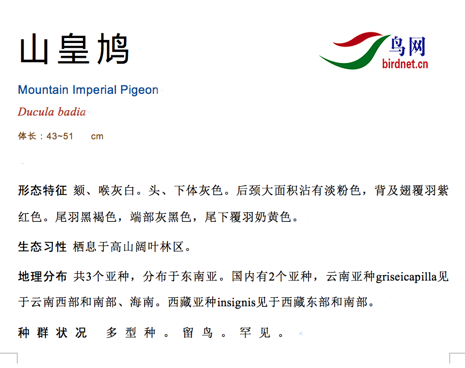 鸟种目科:鸽形目 > - 鸠鸽科 > - 山皇鸠
