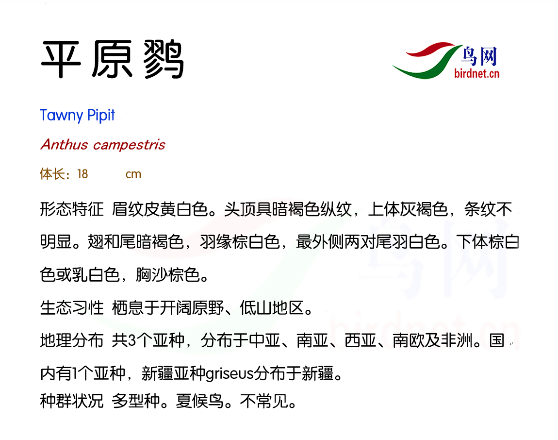 鸟种目科:雀形目 > - 鹡鸰科 > - 平原鹨