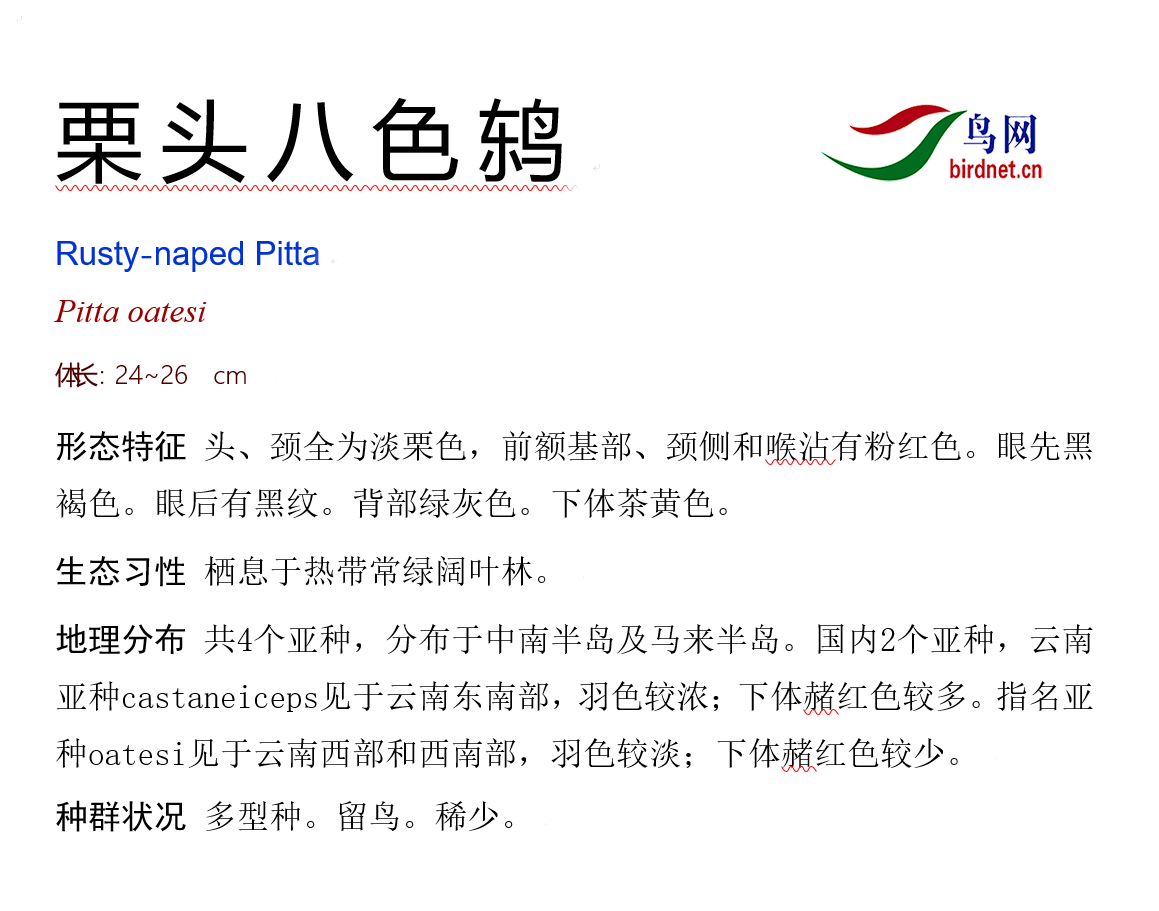 鸟种目科:雀形目 > - 八色鸫科 > - 栗头八色鸫