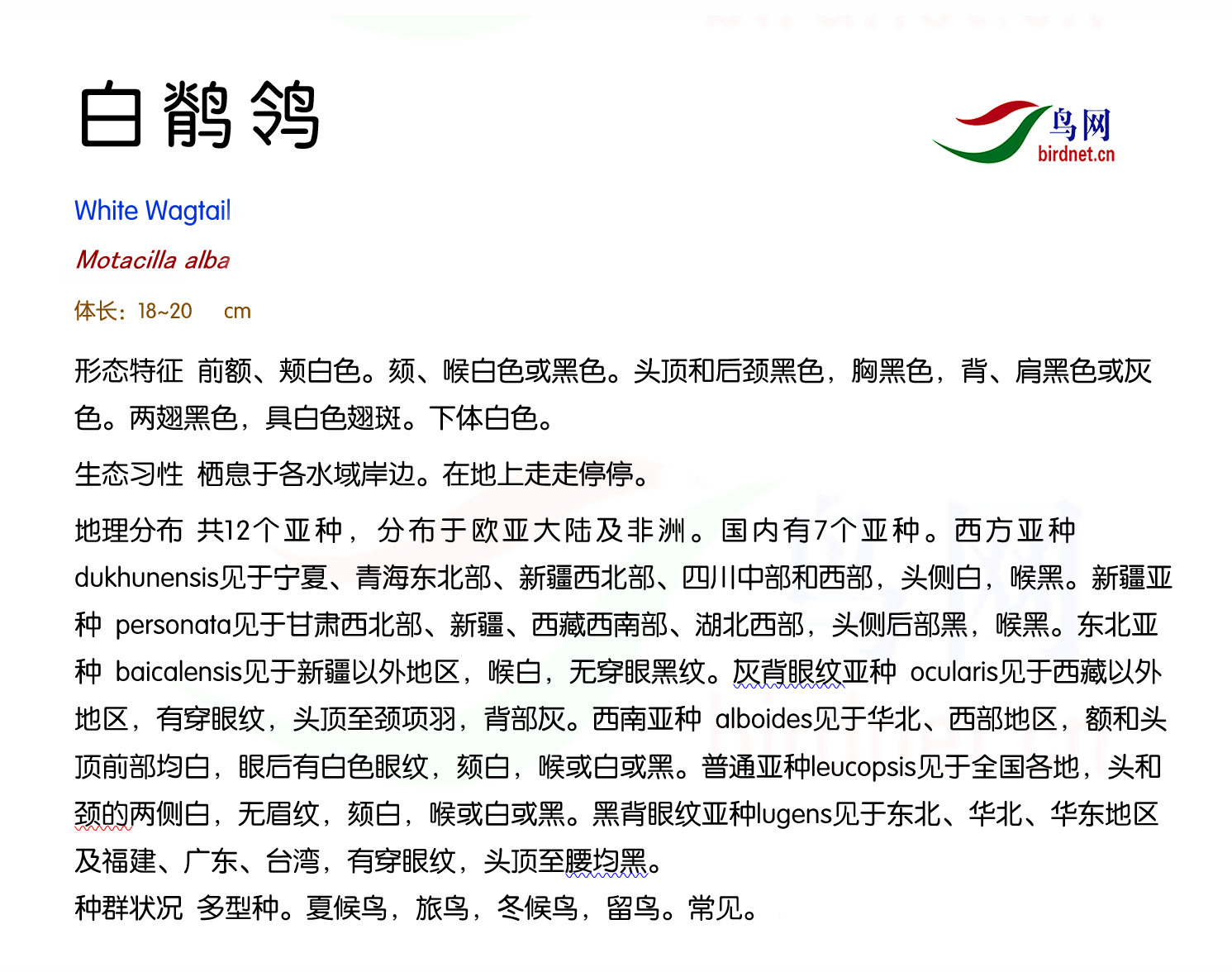 鸟种目科:雀形目 > - 鹡鸰科 > - 白鹡鸰