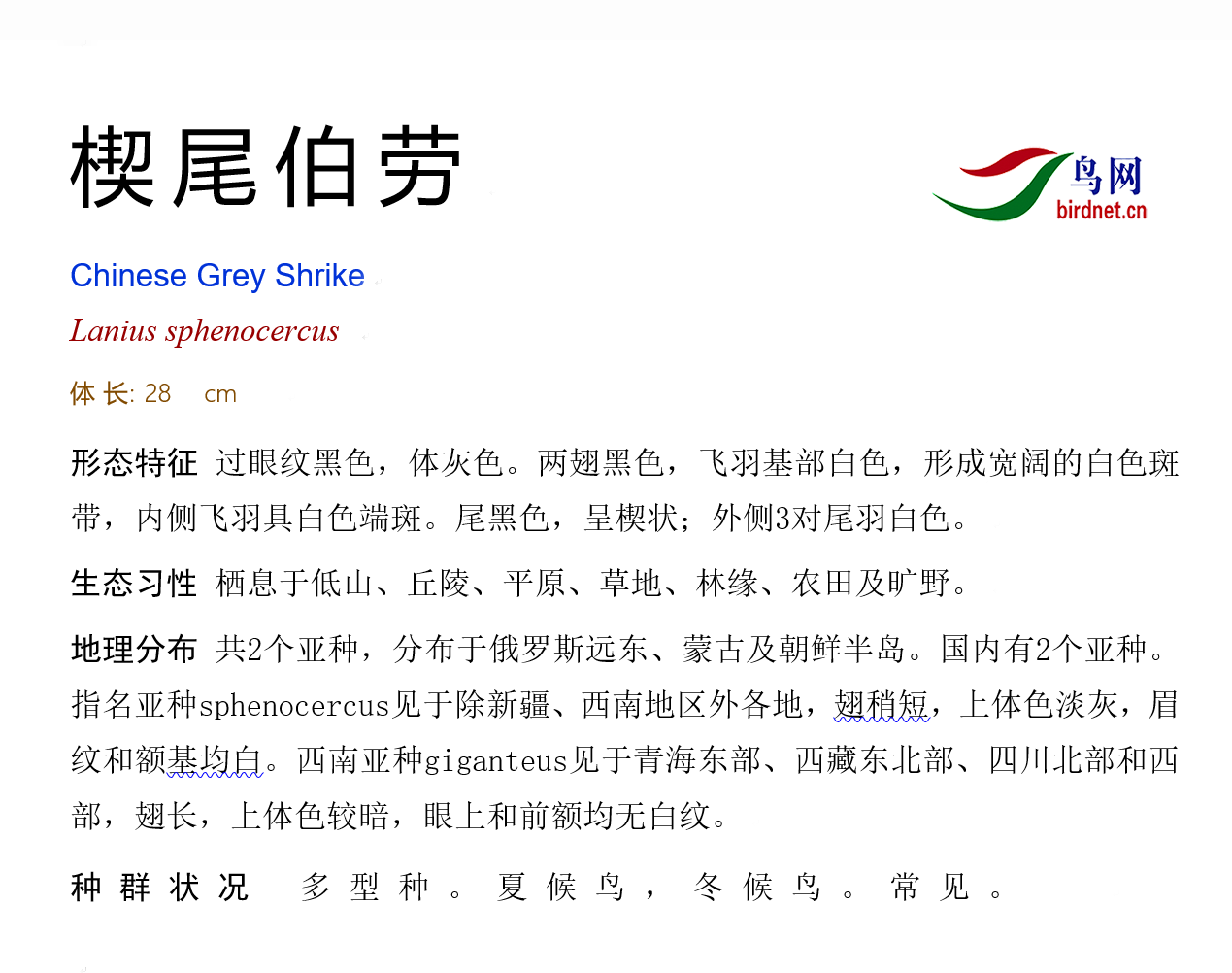 鸟种目科:雀形目 > - 伯劳科 > - 楔尾伯劳