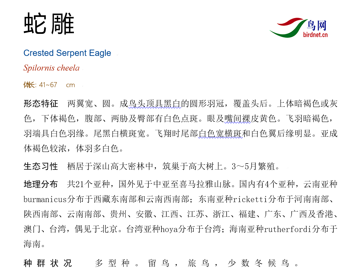 鸟种目科:鹰形目 > - 鹰科 > - 蛇雕