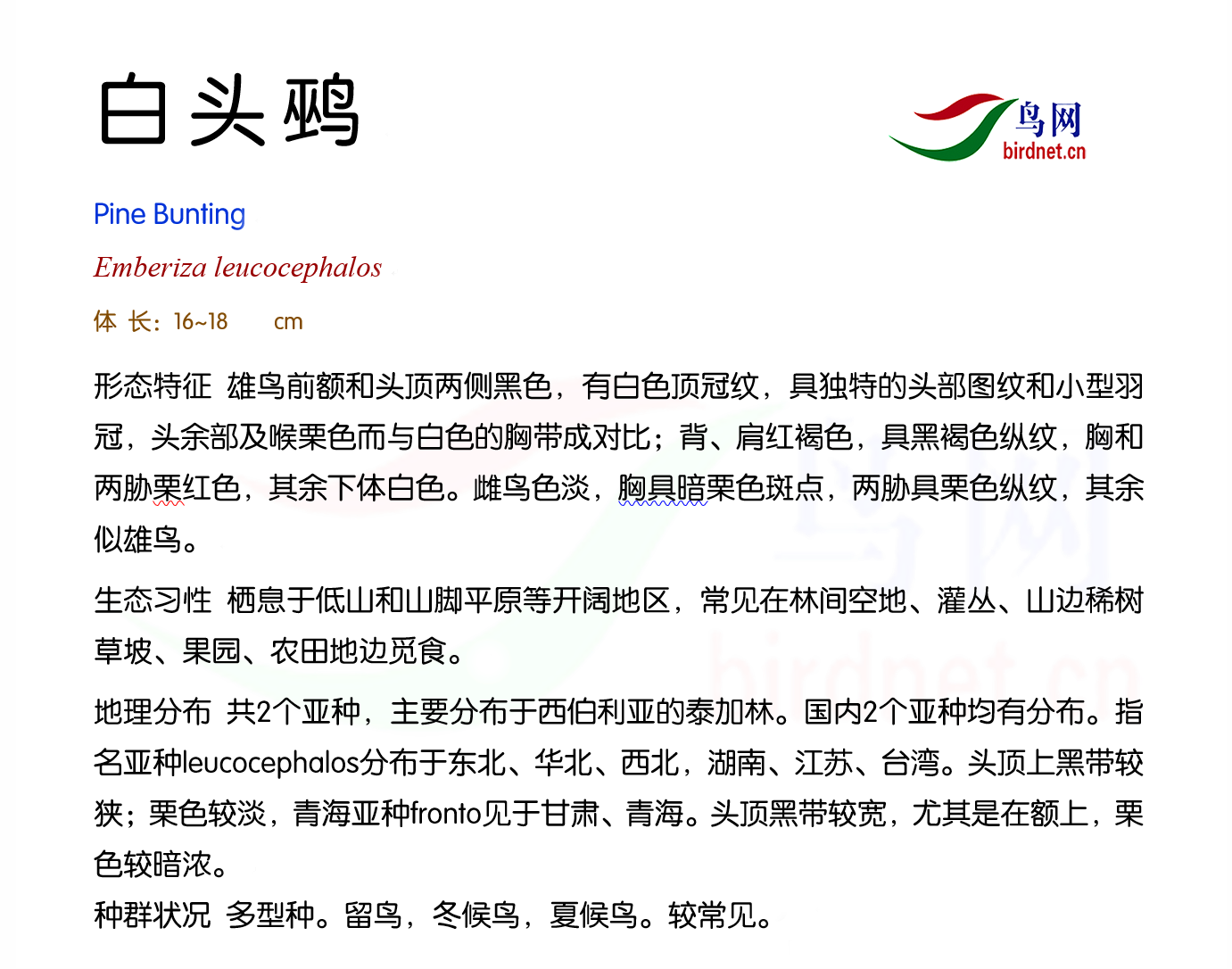 鸟种目科:雀形目 > - 鹀科 > - 白头鹀