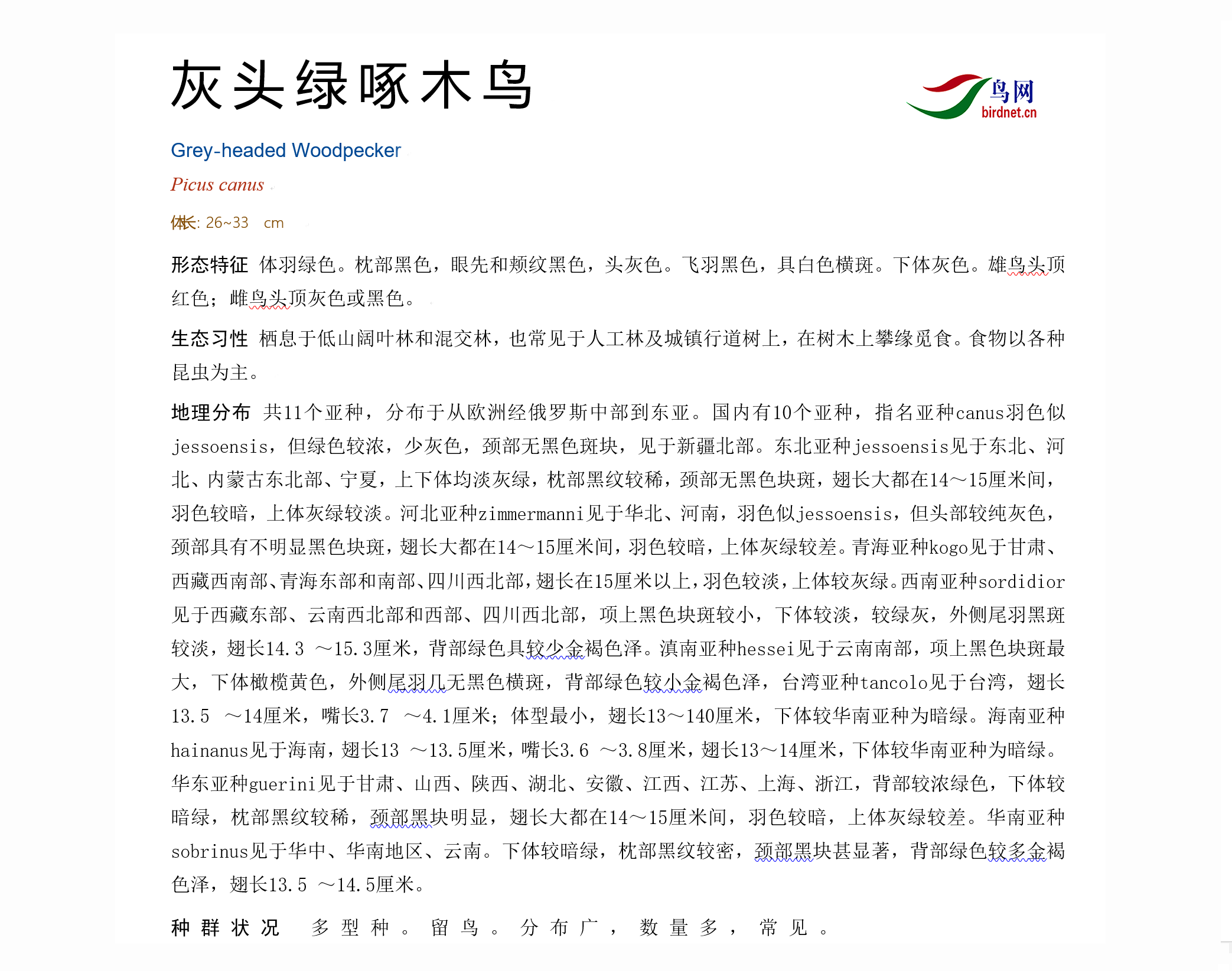 鸟种目科:啄木鸟目 > - 啄木鸟科 > - 灰头绿啄木鸟