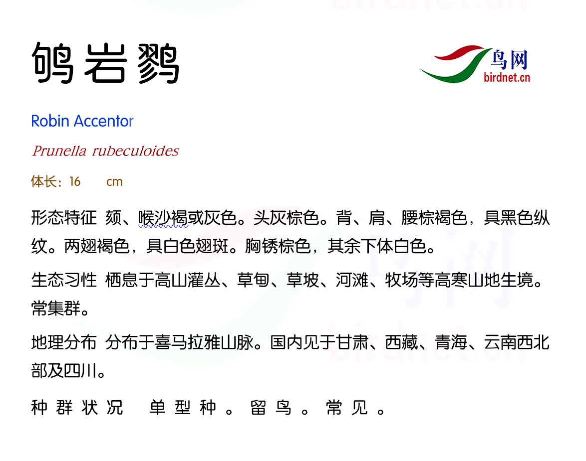 鸟种目科:雀形目 > - 岩鹨科 > - 鸲岩鹨