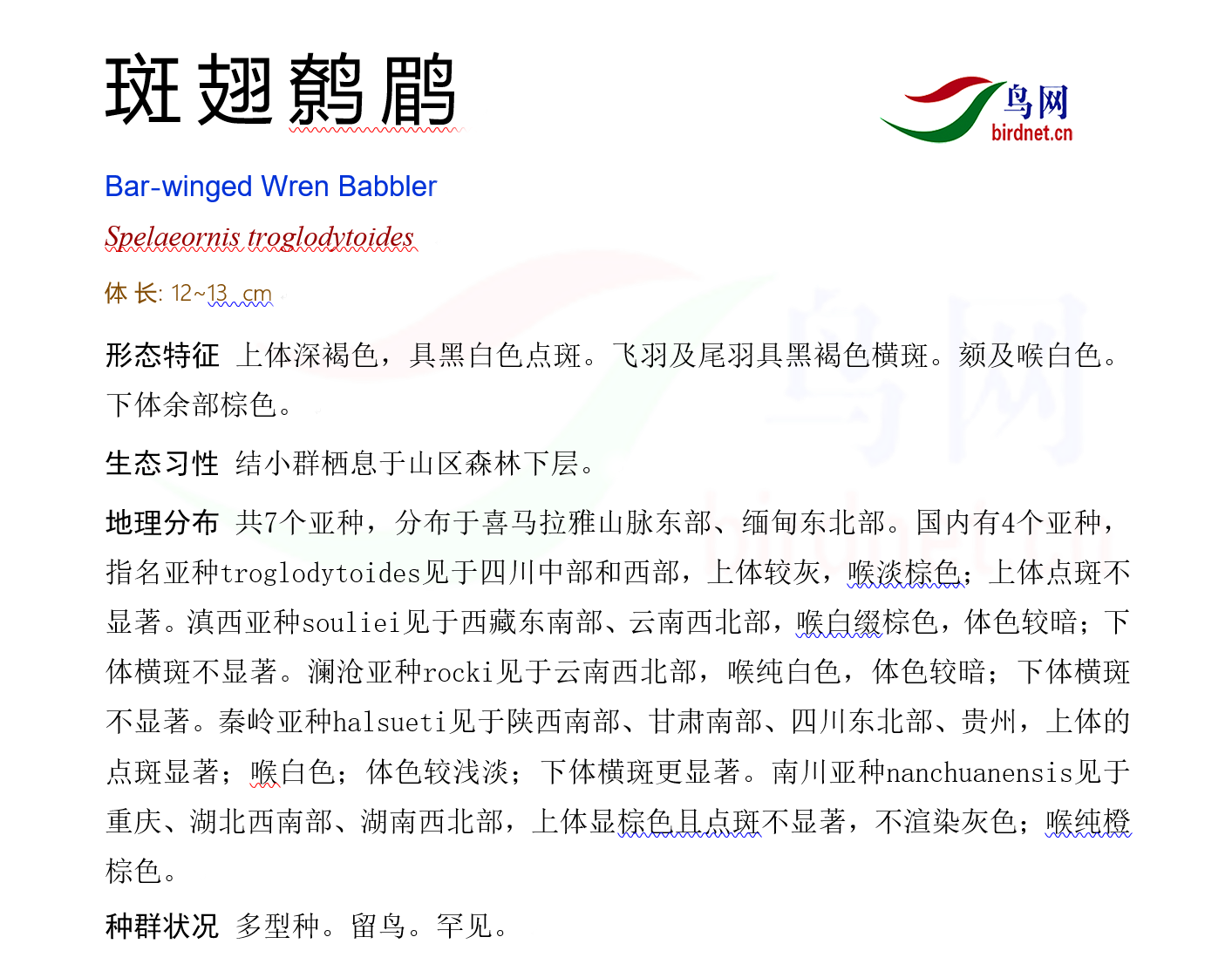 鸟种目科:雀形目 > - 林鹛科 > - 斑翅鹩鹛