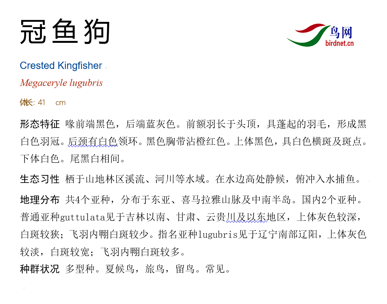 鸟类名称:冠鱼狗