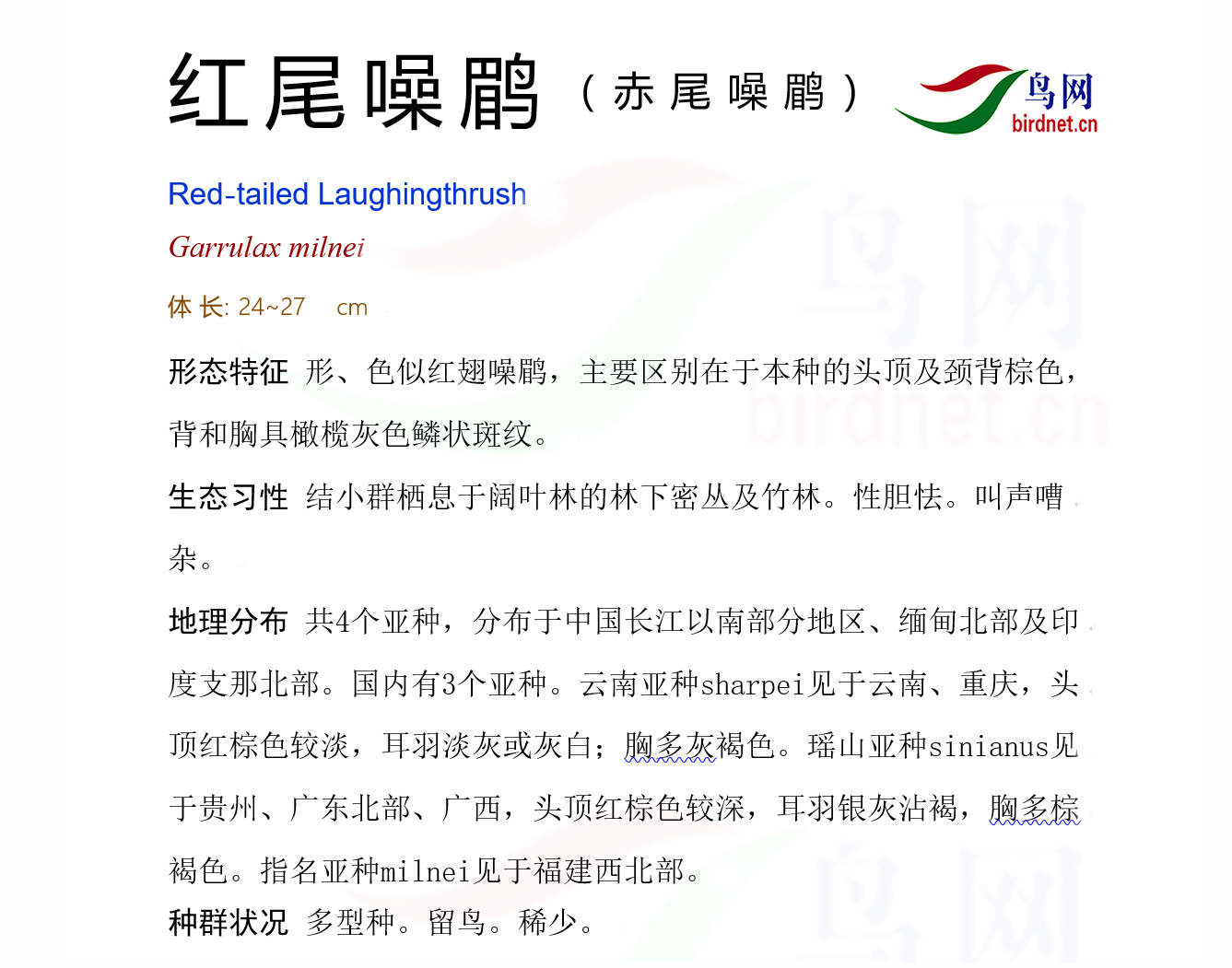 鸟种目科:雀形目 > - 噪鹛科 > - 红尾噪鹛