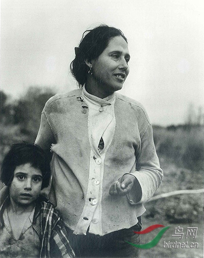 因皮里尔谷----墨西哥女人和孩子,1935年 兰格特意去拍摄了从事繁重劳动的妇女们。加利福尼亚州 和德克萨斯大型农业公司的工头不愿意她到农场里来,所以如果 想拍照,只能等到工人们中间到农场边休息的时候。像往常一样, 她总是试图跟拍摄对象交谈。在这个画面中,她很明显地被这个 女人破烂的衣服和她面容中精致的美感所形咸的鲜明对比触动了。