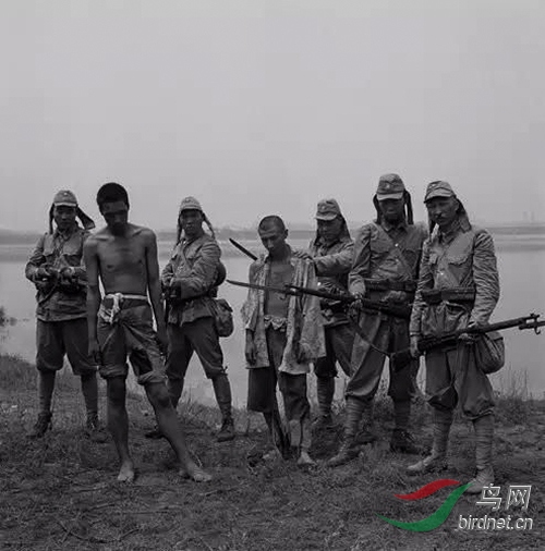 一群抗日影片中的演员,2000年,北京,芦沟桥 2001年,刘铮出版了他的第一本摄影作品集《国人》。在这部作品中,两张有关抗日战争的照片引起了我的兴趣。一张作品的标题是《一群抗日影片中的演员,2000年,北京,芦沟桥》,另一张的标题是《纪念馆中大屠杀的场面,2000年,江苏,南京》。前者的画面中,是一群持枪的日本士兵与两个手无寸铁的中国人。而在后者的画面中,一个死去的女子仰面倒在一个死去的男人身上,她的上身裸露,而在她的身边,则是一个面对死去的母亲茫然不知所措的男孩。很显然,这个画面拍摄自南京大屠杀纪念馆。这两个画面的相同之处是,都是有关中国现代史上的重大历史事件抗日战争。