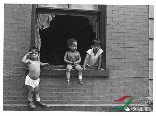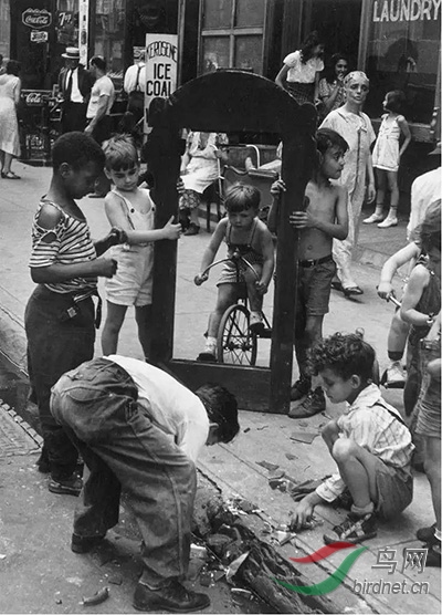 无题,美国纽约,1940年 这张照片的主体与背景看似相当纷乱,毫无秩序可言,几个孩童拿着破损的镜台在街头嬉闹,这样的画面却形成了“框中之框”的视觉造型,莱维特敏锐的眼光看到了这一幕,她用手中的相机揭示了真实的视觉之美。