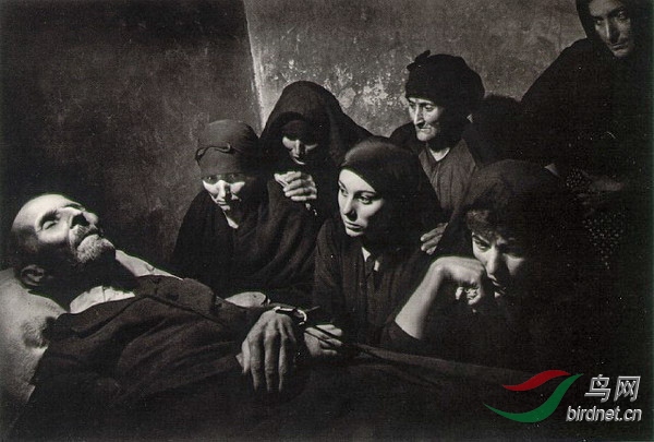 20世纪40-60年代,国际空运及电视机还不普及,这是平面媒体报道摄影的黄金岁月。此作是尤金·史密斯受《生活》杂志委托,拍摄的《西班牙村庄》图片故事中的一幅。他带了一位助手、一位翻译从英国出发,展开了一趟超过半年时间的欧洲之旅。《生活》杂志编辑部希望史密斯能聚焦于佛朗哥独裁政权下食物供应的问题,但是史密斯希望从政治的角度切入,去拍摄源自佛朗哥政权造成的人民贫困与恐惧的处境。史密斯花了两个月时间,四处寻觅合适的拍摄场地,终于在靠近葡萄牙的西部贫穷村镇、人口仅数百人的德赖土萨村庄落脚。 这张照片是他在农村捕捉到的弥留之际的老者与守丧亲人。照片里的灯光极具戏剧效果,史密斯请助手在左侧打了闪光灯,创造了六位主体人物与背景之间极大的明暗反差,观者会立即陷入这回荡的哀伤情绪中。