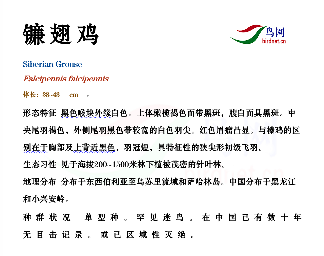 筑巢的生境一般在向阳的山坡上的越桔等灌丛中,常在倒木下或树根旁的地面上。巢很简陋,在地面凹处用松枝和越桔等灌木的小枯枝搭成,内有树叶、羽毛等物铺垫。镰翅鸡每窝产6-10个卵。卵的颜色为淡褐色,具橄榄色或褐色小斑点,大小为43-48×31-32毫米。孵化由雌鸟承担,孵化期至今尚不知晓,只是6-8月可以见到雌鸟带着一窝雏鸟在山林中活动。 |