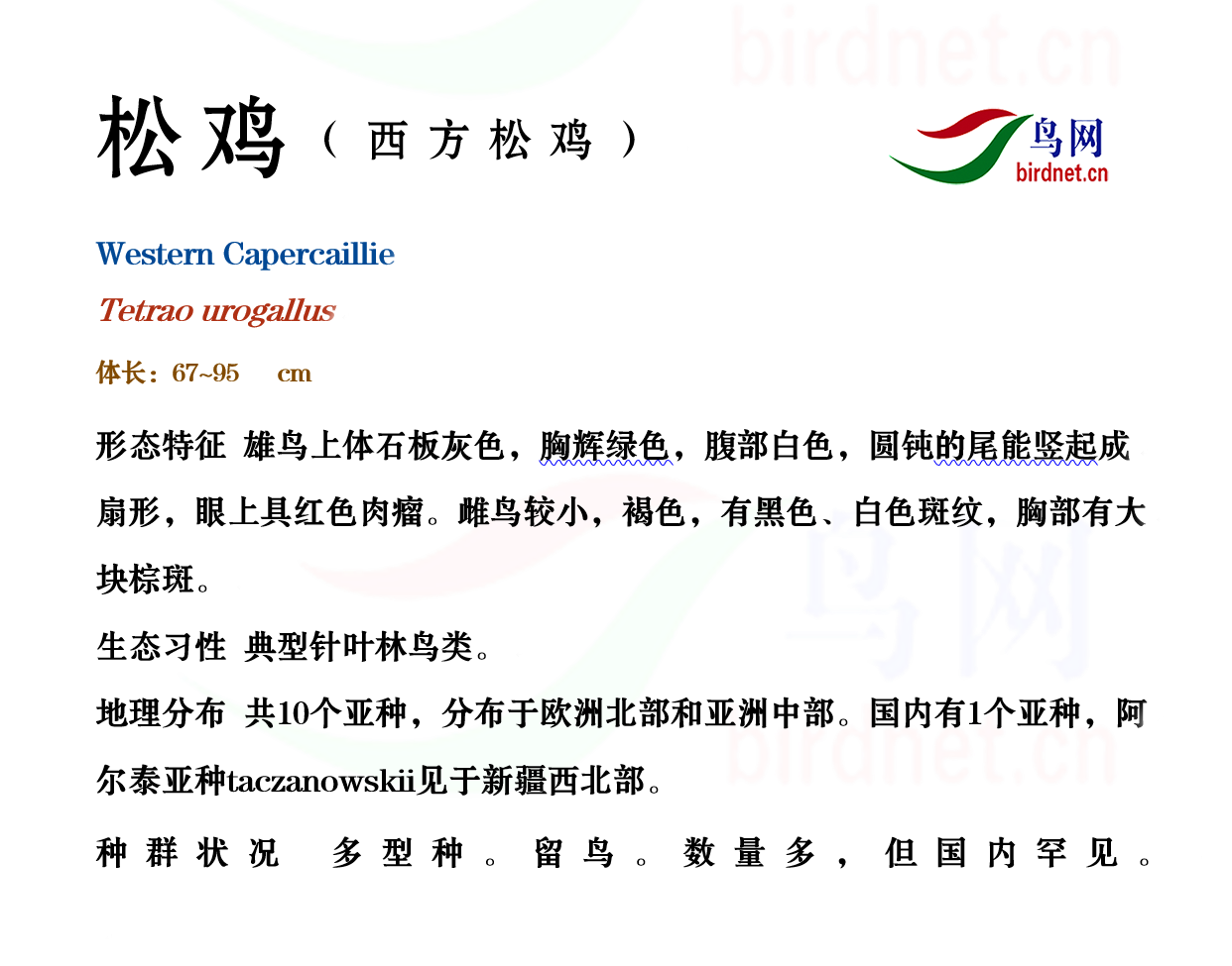 @鸟类图志 老师收集,感谢)松鸡(学名:Tetrao urogallus)是松鸡科松鸡属鸟类