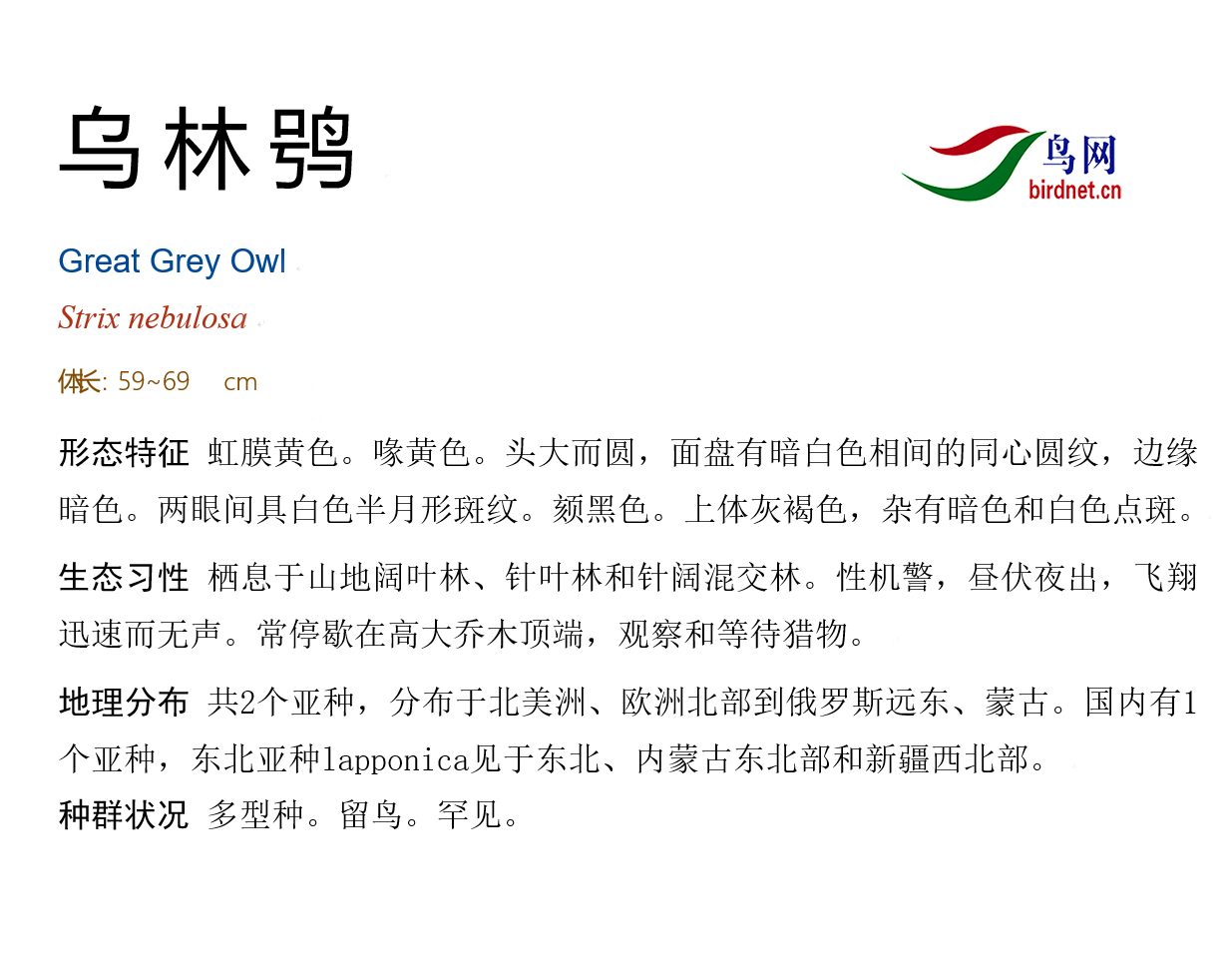 乌林鸮头大而圆,面盘显著,呈圆盘形、灰色或灰白色,具一些呈波状的黑色同心圆圈。眼先、眼上和眼下白色并连结一起形成显著的新月形斑,皱领羽毛特密集、黑褐色而杂有白色横斑。上体灰褐色具白色横斑及虫蠹状斑和褐色羽干纹,尤以背部纵纹较粗著,肩部较白,外翈几纯白色具少数褐色横斑。翅上初级覆羽和小翼羽较暗褐,白斑不显,大覆羽、中覆羽外翈具大型白色卵圆形斑。飞羽暗褐色具浅褐色横斑,内翈茶黄色,次级飞羽亦具浅褐色横斑,外翈微沾白色,最内侧次级飞羽同背,腰和尾上覆羽羽干纹不显。尾上覆羽较短具显著横斑,尾羽灰褐色,具5道不明显的浅白色横斑和白色斑点。颏暗褐色具少许白色斑点,喉黑色,两侧各有一块白斑,其余下体污白色,有宽阔的褐色纵纹,在一些松散的羽枝上有细的横斑。跗蹠和趾被羽,灰白色具淡褐色横斑。尾下覆羽白色,被有稀疏的横斑。