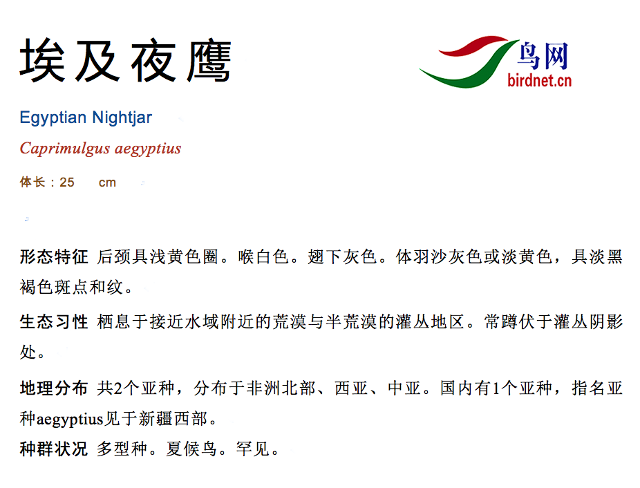 埃及夜鹰是夜行性鸟类,主要在黄昏和夜晚活动,白天多蹲侠在地上或灌木下阴影处休息。黄昏时频繁的在地上或水面飞行和猎食。飞行快而迅速,通常紧贴地面或水面低飞。叫声为单音节,鸣叫时不断重复,其声似"Kre-kre-kre"或"Korr-korr--korr"声。主要以昆虫和昆虫幼虫为食。觅食方式主要通过低空飞行,在飞行中猎食,有时也在地上或水面猎食。The Egyptian nightjar is native to northern Africa, the Arabian Peninsula and the Middle East. Its range includes Afghanistan, Algeria, Bahrain, Chad, Egypt, Iran, Iraq, Israel, Jordan, Kazakhstan, Kuwait, Libya, Mali, Mauritania, Morocco, Nigeria, Oman, Pakistan, Saudi Arabia, Senegal, South Sudan, Sudan, Tajikistan, Tunisia, Turkmenistan, United Arab Emirates, Uzbekistan and Yemen. It is a rare visitor to Europe, and has occurred as a vagrant in Denmark, Germany, Italy, Malta, Sweden and the United Kingdom.[1] Its typical habitat is open desert with a few scattered trees or bushes. It is often found near water in areas with sparse vegetation and scrub. Over-wintering birds in Sudan can be found in areas with long grass.[4]