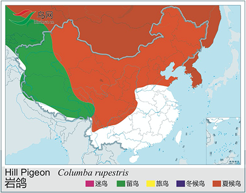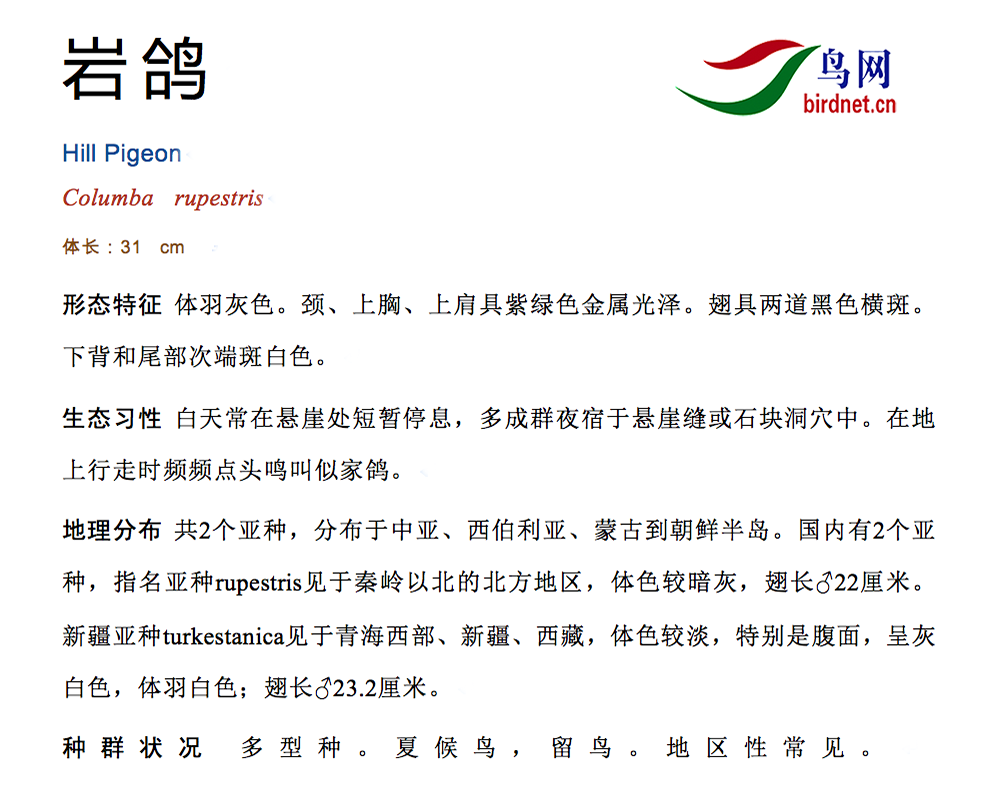 岩鸽雄鸟头、颈和上胸为石板蓝灰色,颈和上胸缀金属铜绿色,并极富光泽,颈后缘和胸上部还具紫红色光泽,形成颈圈状。上背和两肩大部呈为灰色,翅上覆羽浅石板灰色,内侧飞羽和大覆羽具二道不完全的黑色横带,初级飞羽黑褐色,内侧中部浅灰色,外侧和羽端褐色,次级飞羽末端也为褐色,下背白色,腰和尾上覆羽暗灰色。尾石板灰黑色,先端黑色,近尾端处横贯一道宽阔的白色横带。颏、喉暗石板灰色,自胸以下为灰色,至腹变为白色,腋羽也为白色。