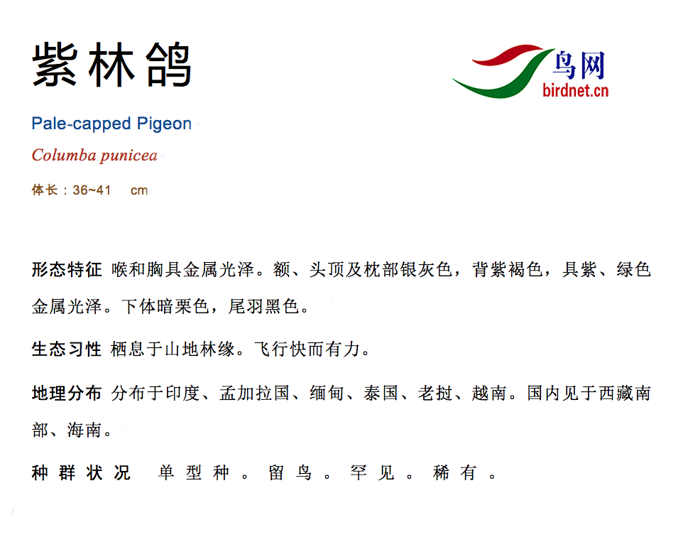 综述:中等体型(35厘米)的黄褐色和灰色鸽。头顶及颈背灰白。特征为脸下及下体黄褐色。上背及翼覆羽栗褐,腰青灰,尾黑褐。整个体羽具绿色及紫晶色闪辉。背上及颈侧的绿色最为闪光。眼周裸露皮肤及蜡膜洋红。