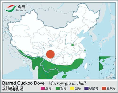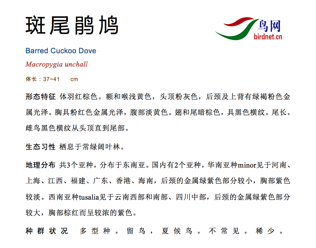 综述:体大(38厘米)而尾长的褐色鹃鸠。背及尾满布黑色或褐色横斑。头灰,颈背呈亮蓝绿色。胸偏粉,渐至白色的臀部。雌鸟无亮绿色。背上横斑较密,尾部横斑有别于同地区的其他鹃鸠。