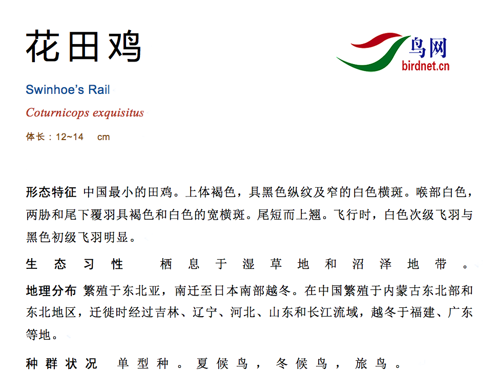 :体甚小(13厘米)的点斑田鸡。上体褐色,具黑色纵纹及白色细小横斑;颏、喉及腹部白;胸黄褐色;两胁及尾下具深褐色及白色的宽横斑。幼鸟色更深。尾短而上翘。飞行时,白色次级飞羽与黑色初级飞羽明显。