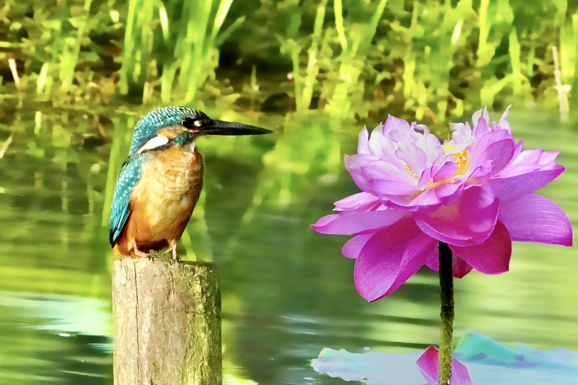 翠鸟在荷花里觅食 |
