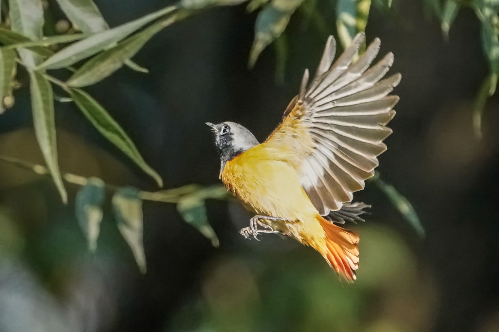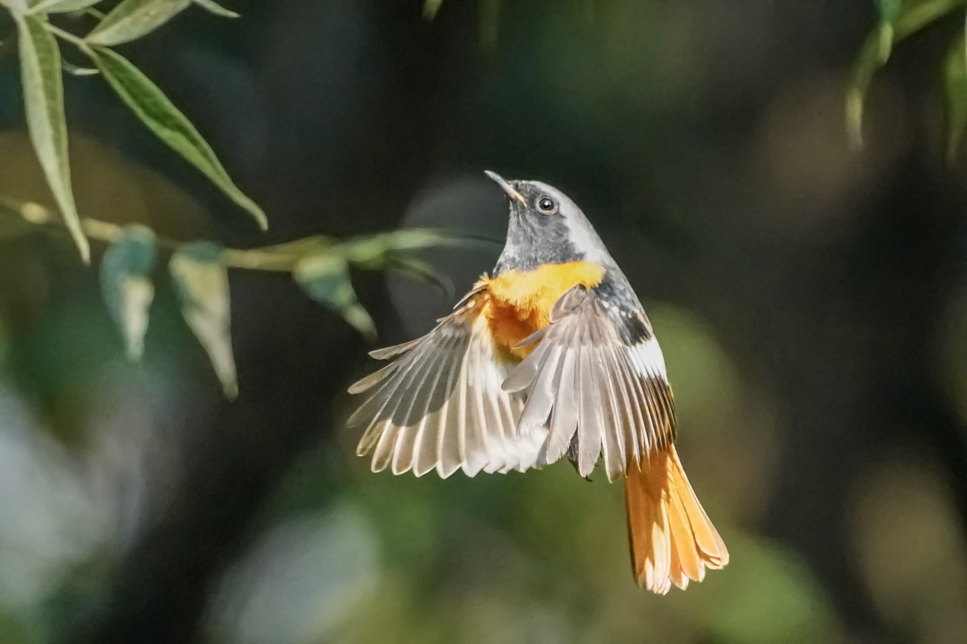 北红尾鸲来到上海世纪公园,在公园树木上寻找食物,在空中盘旋,展示自己的魅力。