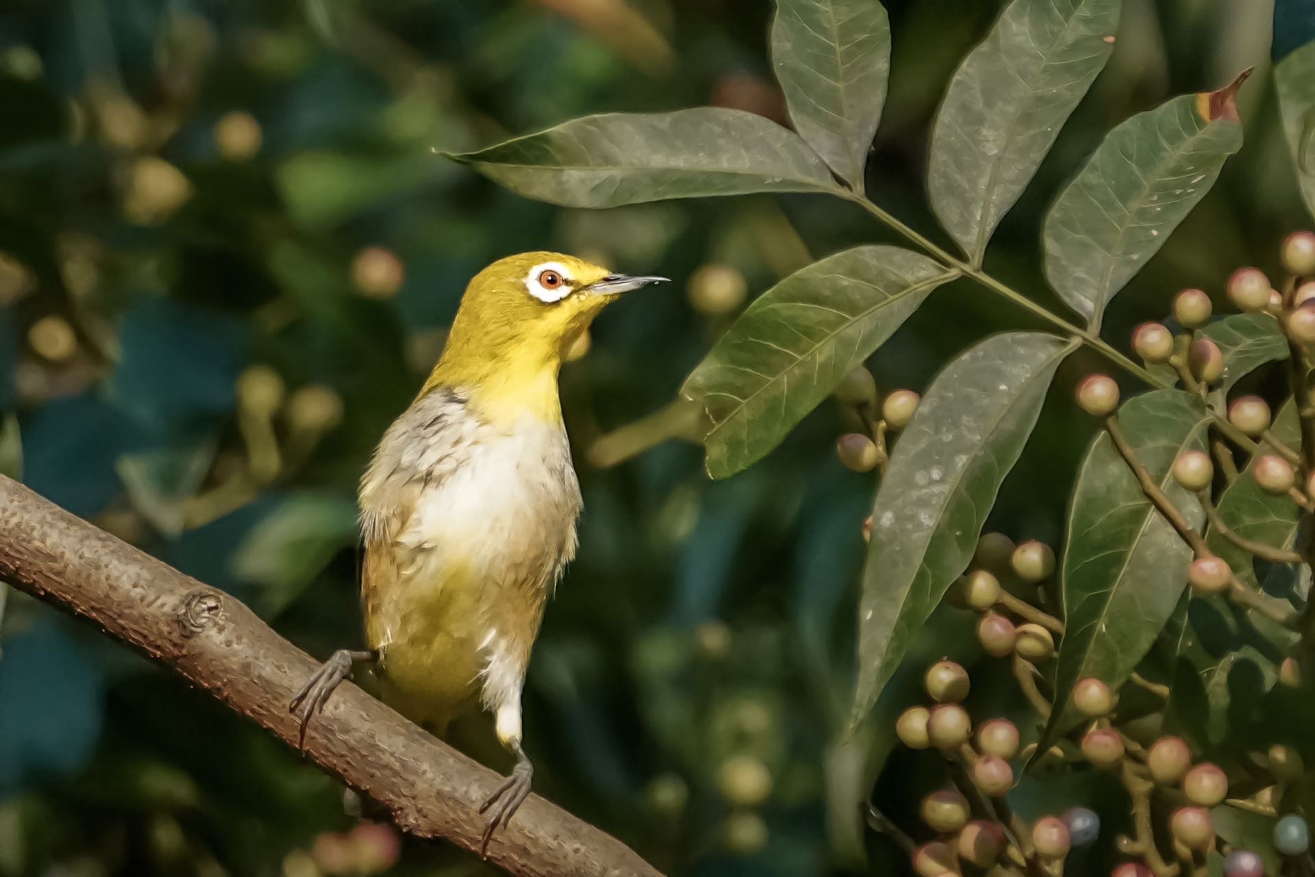 绣眼在上海世纪公园黄连木上分享果实,来回自由上串下跳。
