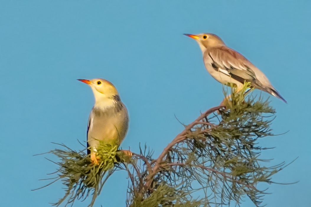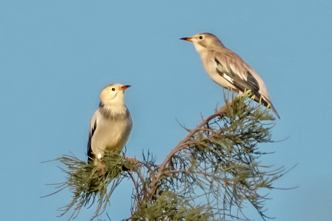 丝光椋鸟来到上海世纪公园,一对情侣丝光椋鸟在高高的水杉树梢上眺望。