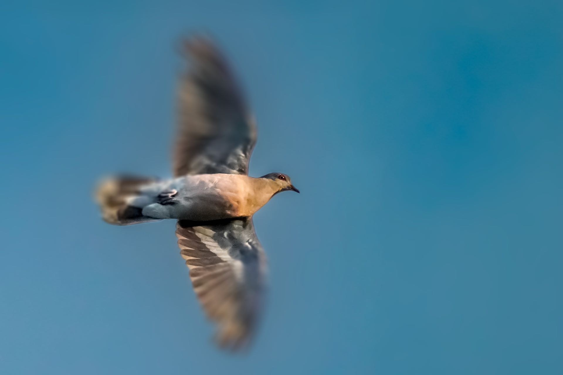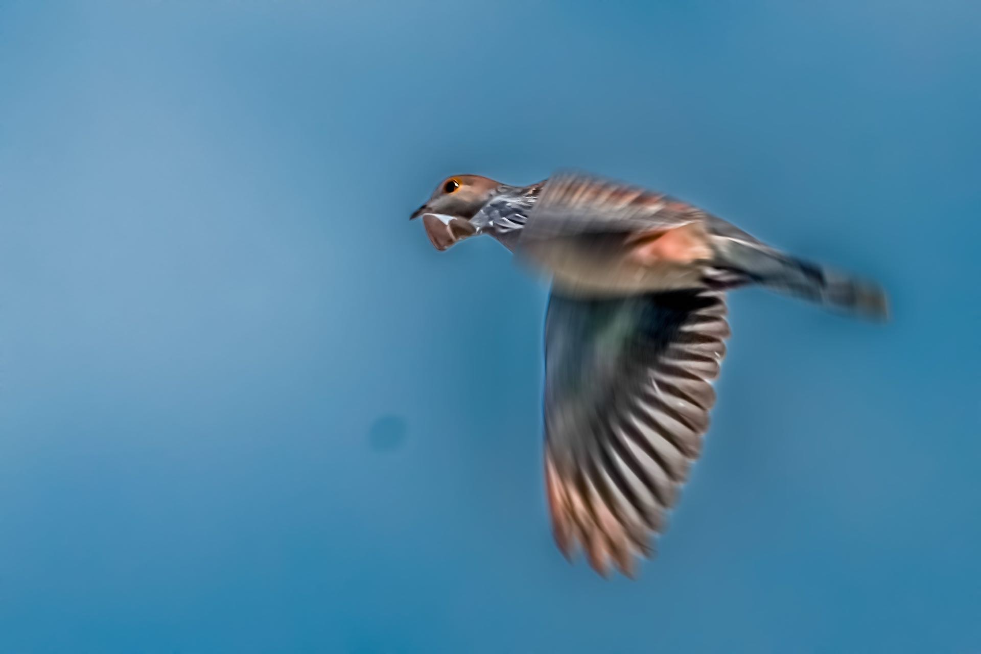 山斑鸠早上在上海世纪公园鸟岛上空飞行。