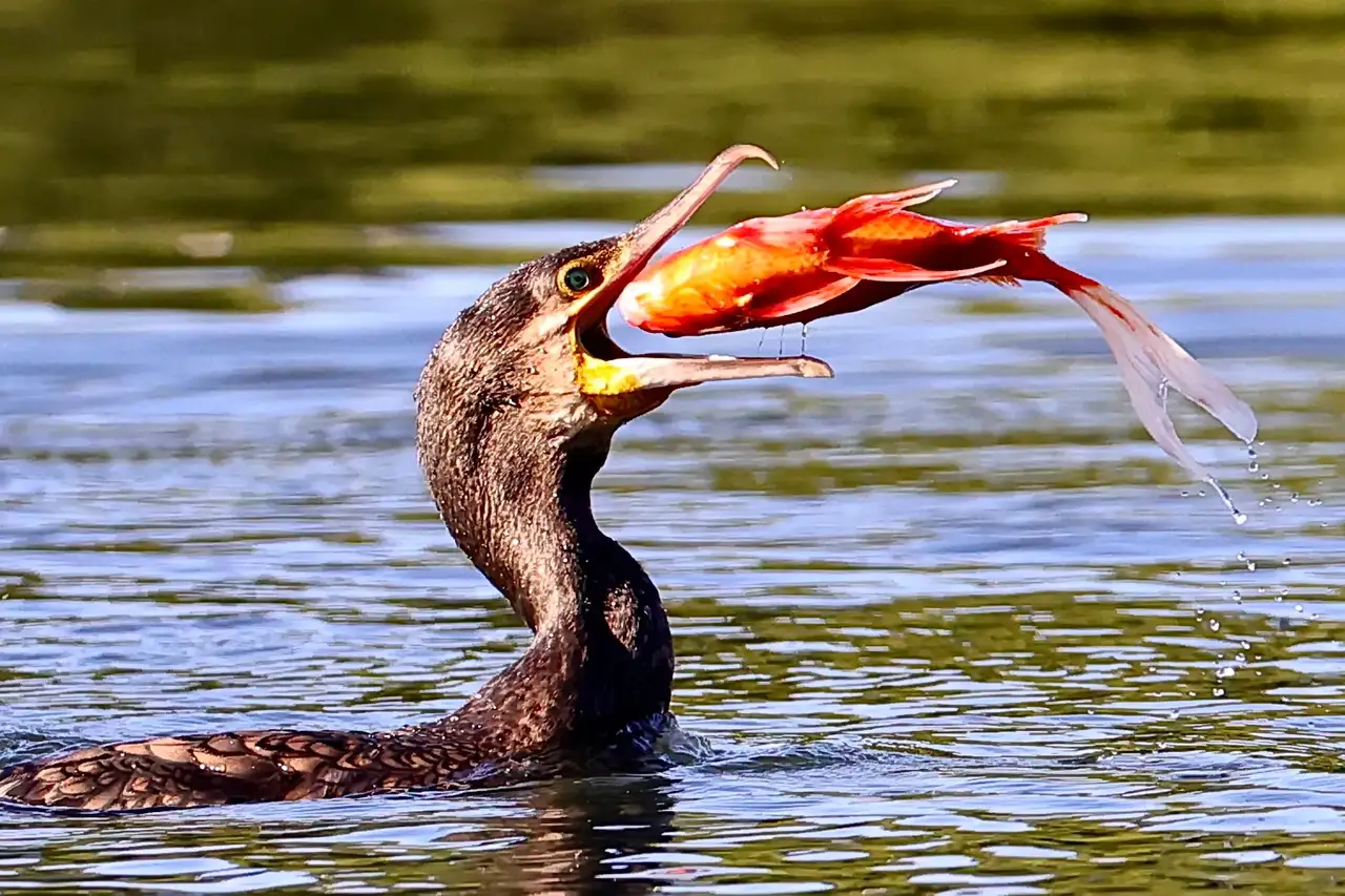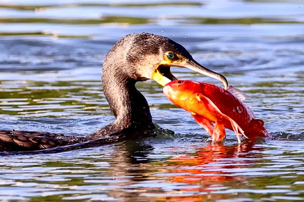 2023年10月19日在德阳旌湖岷江大桥下游水段,一只鸬鹚一个潜水追逐到一条红鲤鱼,露出水面的瞬间,它亨受美食我拍下了这个难忘记了瞬间。