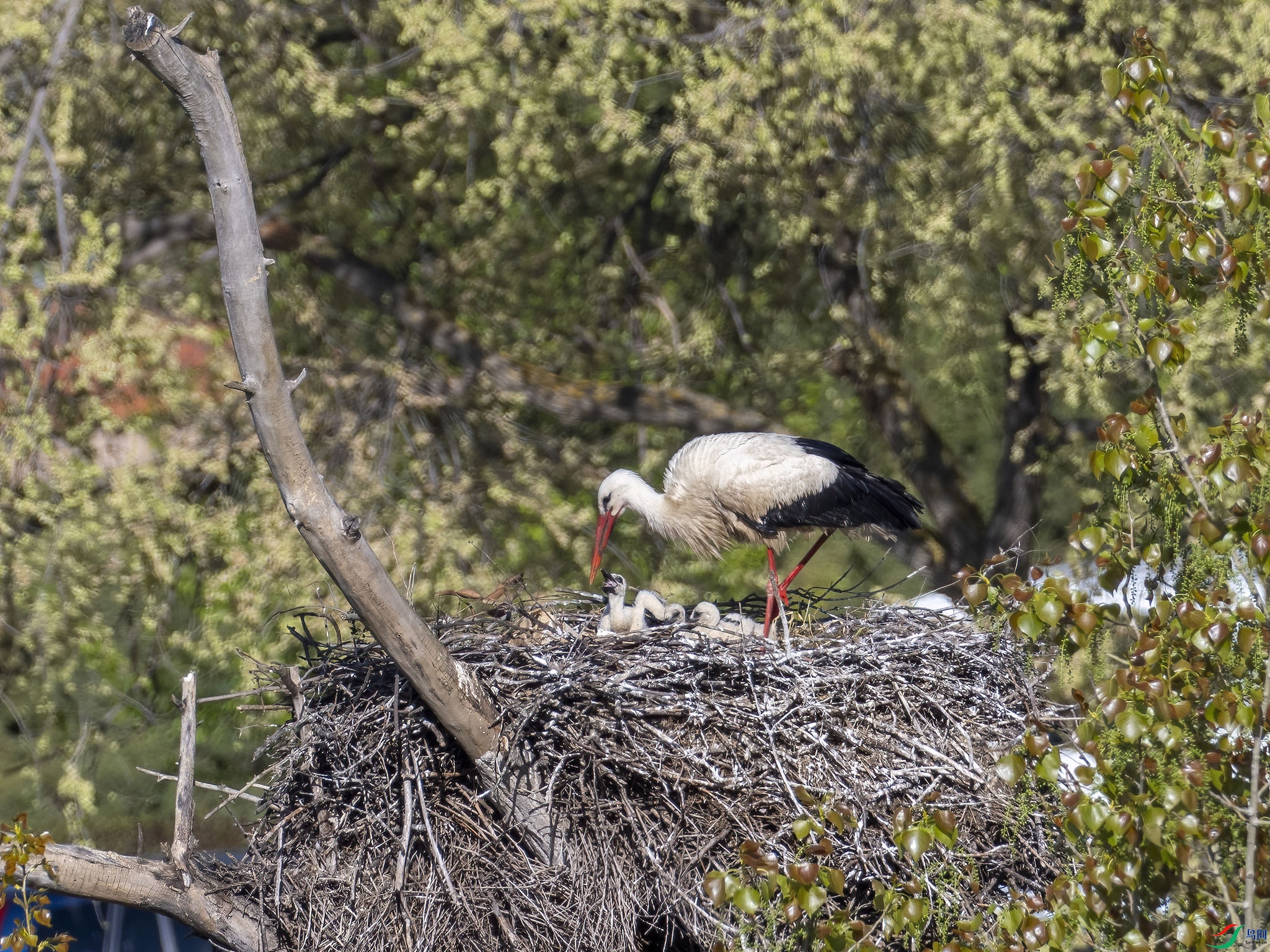 雌鸟飞离鸟巢,估计去早餐进食去了,再等良久,雌鸟归巢,把胃中食物反漾出来,白鹳宝宝们争抢时食。