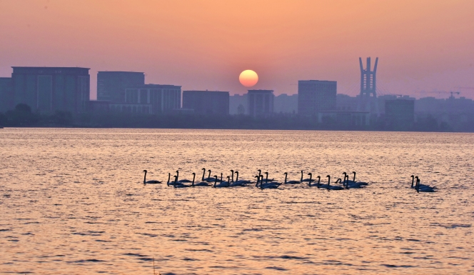 朝阳与疣鼻天鹅相映成景